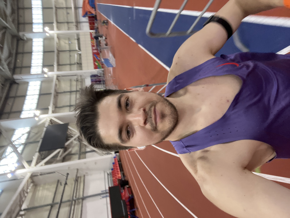 A male individual, appearing in his late 20s to early 30s, is captured in a selfie within an indoor athletic track and field facility in Tashevka, Russia