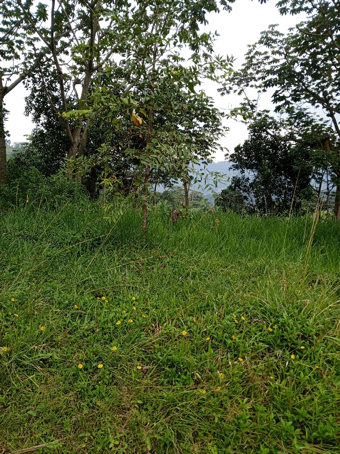 This image, located in Thotagamuwa, Sri Lanka, depicts an overgrown natural landscape. The foreground is dominated by dense, varying heights of green grass and ground cover, with numerous small yellow flowers visible across the lower portion of the frame. Several trees with prominent brown trunks and full green canopies occupy the midground. A partially visible, slender tree trunk is positioned near the center of the midground, with a faint brown, fibrous object adhering to it on the right side. The background features a range of distant, forested mountains, appearing hazy under an overcast or diffused pale sky. No people, animals, or man-made objects other than possibly cultivated trees are evident. No specific actions or interactions are occurring.
