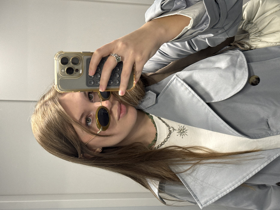 An adult female is depicted in a mirror selfie taken indoors within the city of Vozdovac Urban Municipality, Serbia. She is positioned centrally, gazing directly into the camera/mirror. Her long, straight, light brown hair is parted on the side and falls over her shoulders. She wears oval-shaped sunglasses with dark lenses and thin gold-toned frames, revealing her eyes above the frames. A small stud earring is visible in her left ear. Her attire consists of a light blue-grey trench coat, partially unbuttoned, revealing a white or off-white crew-neck top underneath. Visible jewelry includes two necklaces: an inner choker-style necklace made of small, irregular green beads, and an outer longer silver-toned chain necklace featuring a circular clasp and a multi-pointed star-like pendant. On her right hand, which holds a smartphone, she wears a silver-toned ring with an organic, wavy design on the middle finger. The smartphone, likely an iPhone model with three prominent camera lenses, is encased in a clear protective cover with a textured dark grey grip pad on the back. A light-colored (possibly off-white or beige) soft bag with a drawstring closure and a brown strap is visible over her right shoulder. The background consists of plain, light-colored walls or panels, with a vertical seam visible behind her, indicative of an indoor setting.