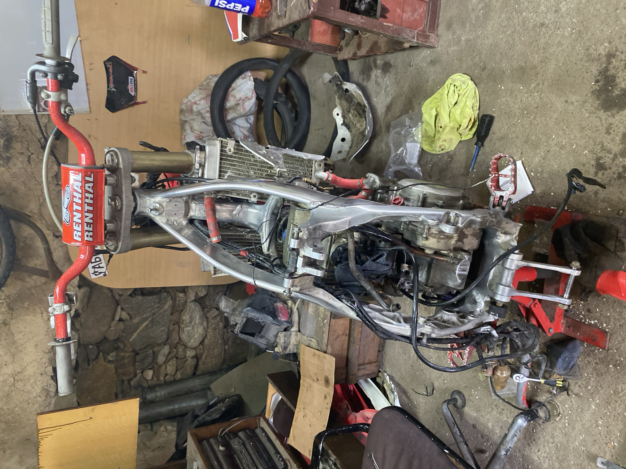 The image depicts a partially disassembled motorcycle in what appears to be a garage or workshop setting