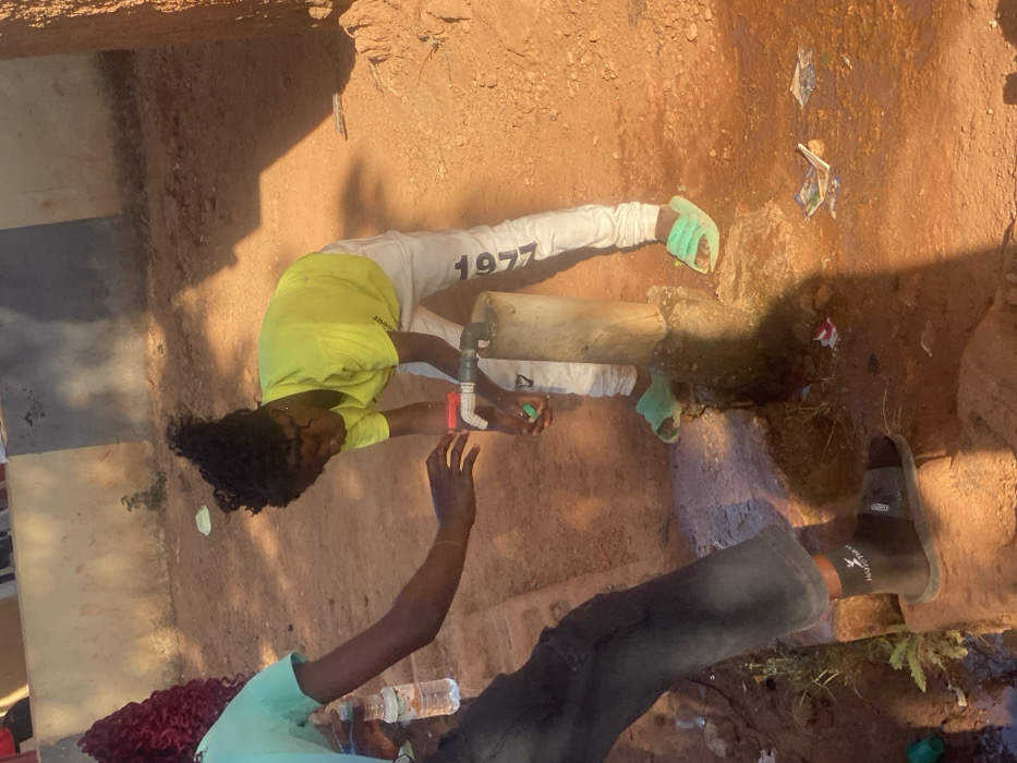 Two individuals are depicted outdoors in Jos, Nigeria, during daylight. In the foreground, a young person with dark, curly hair, wearing a neon yellow t-shirt, white sweatpants with "1977" printed on the right leg, and light green slides, is bent over a functional water tap. This individual is washing their hands or rinsing a small, green object under the flowing water. The water tap, featuring a red handle, is mounted on a light-colored, cylindrical concrete or stone post embedded in the reddish-brown earth. Water has pooled and created mud around the base of the tap. Partially visible to the left, a second young person with reddish-brown curly hair, wearing a light teal t-shirt and dark trousers, stands nearby. A black sock with white text is visible on their left foot, paired with a dark sandal. Their left arm is extended towards the tap area, with the hand positioned near the first person's hands, possibly in an assisting or waiting posture. A clear plastic water bottle with a white label is tucked near the second person's torso. The ground consists of reddish-brown soil, with some scattered debris, including small pieces of paper and plastic. The background shows a light-colored wall and sparse green vegetation. Strong sunlight casts distinct shadows across the ground and objects.