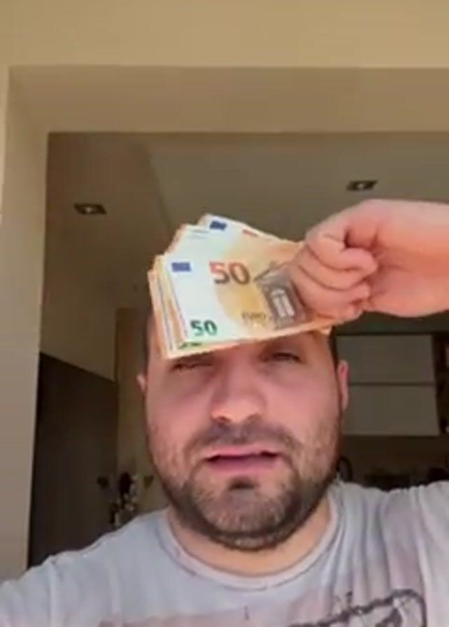 A medium shot shows a fair-skinned man from the chest up, with a short dark-brown haircut and a dark-brown beard, holding a small stack of 50 Euro bills above his forehead