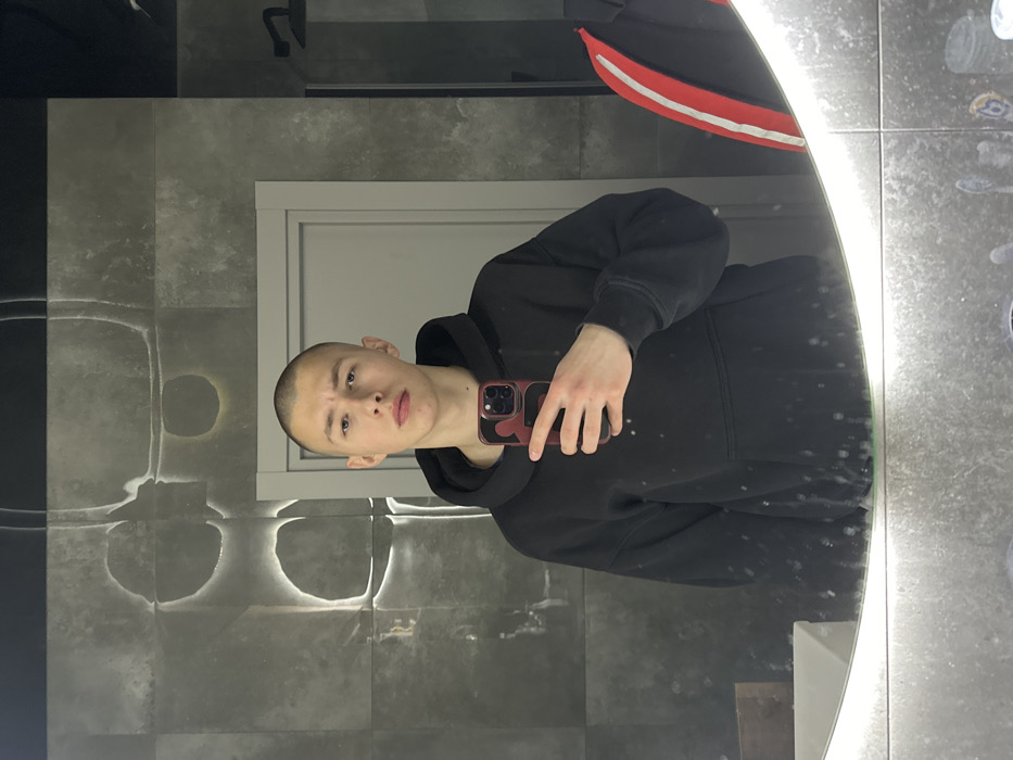 A young adult male, distinguished by a buzz cut, is depicted taking a mirror selfie in a modern bathroom. He wears a black hooded sweatshirt and holds a dark-cased smartphone in his right hand, positioning it to reflect his upper torso and face. His gaze is directed forward with a neutral expression. The mirror is rectangular with a prominent curved bottom edge, featuring an integrated LED light strip along this curve. The mirror surface displays numerous water droplets or smudges, predominantly in the lower section. The background, as reflected in the mirror, includes a wall covered in large, dark grey textured tiles that exhibit irregular lighter patterns. To the right of the male, a light grey door and its frame are visible, along with a dark-colored shower fixture (shower head and arm) positioned within a shower enclosure. The ceiling above is dark. Below the mirror's curved edge, a white sink basin, a small wooden rectangular object, and multiple toothbrushes are partially discernible on a countertop. Additionally, an object with distinct vertical red and white stripes, consistent with a backpack or bag, is reflected to the right side of the male's body. No specific external or internal architectural features within the image allow for the identification of a precise location within the city of Hrodna, Belarus; the scene is an interior, likely a private residence or hotel bathroom.