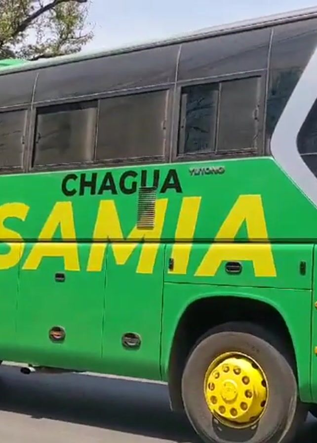 row of bright green buses parked on the side of a road. Each bus has a picture of a woman wearing a hijab, along with the words "CHAGUA SAMIA" and "KAZI NA UTU TUNASONGA MBELE" written on the side in large yellow letters. Several people are walking along the side of the road near the buses. The setting appears to be a sunny day in an urban area.