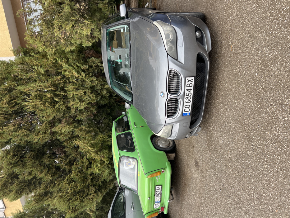 The image displays a parking area in Botevgrad, Sofia Province, Bulgaria. In the foreground, a grey BMW E60 5 Series sedan is parked, facing the viewer. It bears Bulgarian license plate "CO 6854 BX". The front bumper exhibits minor scuff marks and the headlights appear somewhat hazed. To the left and slightly behind the BMW, a bright green Trabant 601 sedan is visible from its rear-left quarter. This vehicle features a yellow stripe running lengthwise over its roof and rear, a tow hitch, and a multi-colored emblem attached to its rear window. Its Bulgarian license plate reads "CO 9027 AK". A third, light-colored vehicle is partially visible on the far left, with only a portion of its front-right side discernible. The ground is a dark grey, coarse-grained asphalt or paved surface, appearing damp. The background consists of a dense, continuous line of tall, green conifer trees, behind which a segment of a light-colored building with a window is visible on the upper right. No individuals are present.