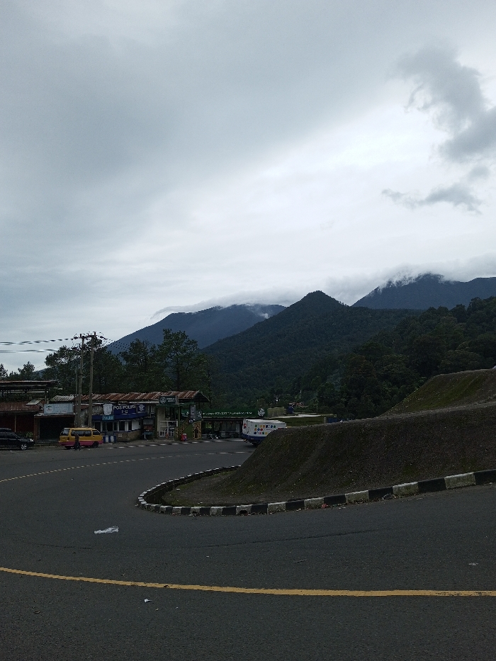 The image depicts a mountain landscape under an overcast sky, observed from a paved road in Adhanur, India. Dark, densely forested mountains rise in the background, with low-lying clouds partially obscuring their peaks. In the midground, to the left of the frame, several modest structures are visible, including a building with a visible sign displaying "POS POLISI" (Police Post) and other indistinct signage. An electrical pole and power lines are present near these buildings. Parked near the structures is a yellow and orange minivan and a dark-colored vehicle. Further to the right, a white commercial vehicle with colorful graphics, possibly a truck or bus, is parked near an elevated, earthen mound covered in sparse vegetation. The foreground features a curving asphalt road with a solid yellow center line and a black and white checkered curb separating it from the elevated mound. Pieces of litter, including plastic debris, are scattered on the road surface. No individuals are clearly visible.