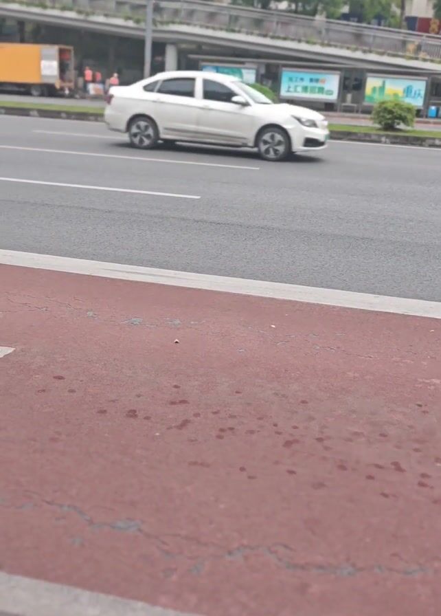 street scene in what appears to be an urban area. The camera is positioned on a red paved path, likely a pedestrian or bicycle lane, next to a road. Cars and trucks pass by on the road, including a red car, a yellow taxi, and a yellow truck. There's an overpass in the background with trees and some buildings. Workers in orange vests are visible on the overpass. There are white lane markings on the road. A painted Chinese character is visible on the red path.