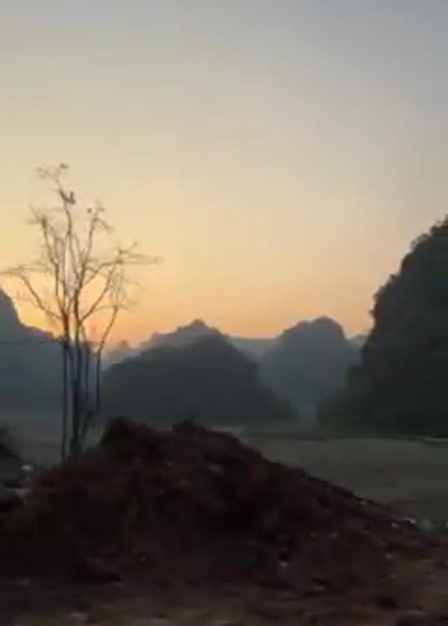 landscape at dawn or dusk. Silhouetted mountains are visible in the distance against a sky with a gradient of yellow and blue. In the foreground, there are piles of rocks and dirt. A banana plant stands to the right. The camera appears to be in motion, panning across the landscape. Later shots reveal additional vegetation and a tarp.