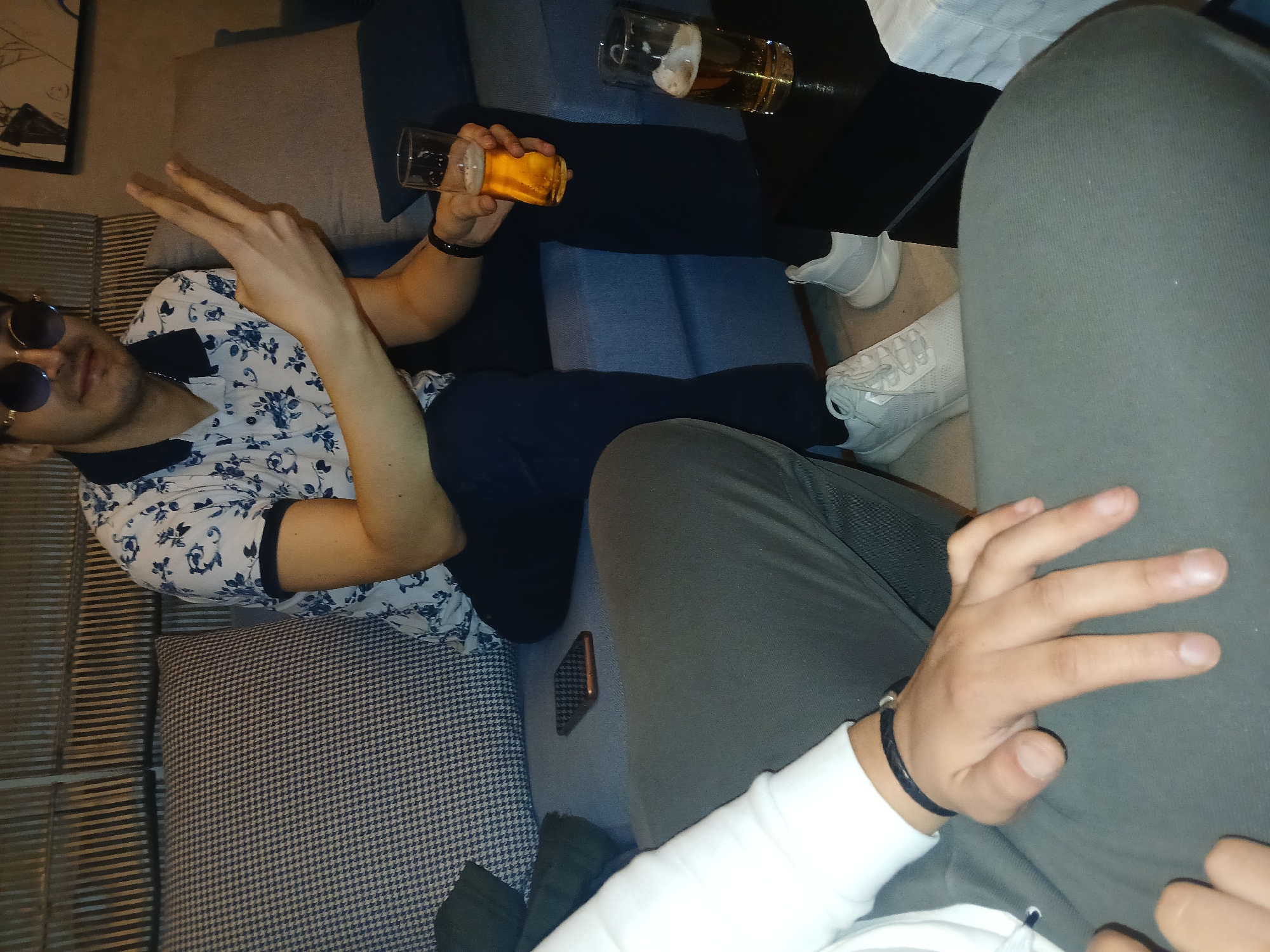 The image depicts three people seated in a lounge setting, possibly in Meknes, Morocco. The person on the left wears sunglasses and a white floral shirt, holding up two fingers while sitting on a patterned cushion. To their right, another individual sits, wearing black pants and light-colored shoes, holding a glass of beer. A third person in grey pants and a white sweatshirt is partially visible on the right, also holding up three fingers. There's a black table with two beer glasses on it. A mobile phone is placed on the blue sofa between the people on the left and right. The setting appears to be a casual indoor social gathering.