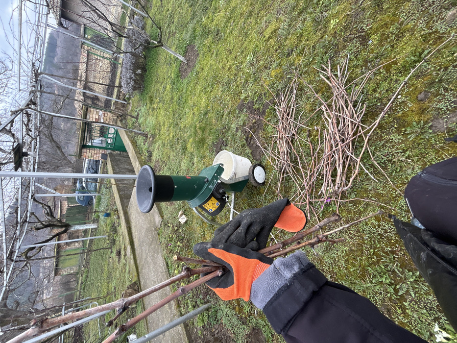 The image presents a first-person view of an outdoor garden scene in Gorsko Ablanovo, Bulgaria, likely during late winter or early spring. In the immediate foreground, a person's hands, encased in grey, orange, and black work gloves, hold a bundle of roughly 10-15 brown, bare woody branches or grapevines. Directly in front of the viewer, slightly to the right of center, stands a green and black electric garden shredder, equipped with a wide black funnel at the top for feeding material. A white plastic bucket with a handle is positioned underneath the shredder's output chute, collecting processed material. The shredder itself has a yellow warning sticker and is mounted on a frame with two white wheels, resting on a surface of green grass and moss. To the right of the shredder, on the ground, lies a substantial pile of additional bare woody branches, identical to those held by the person. The environment comprises a well-established garden or vineyard. A metal trellis structure with bare grapevines extends across the upper and middle portions of the frame, supported by grey metal posts. A concrete path, partially covered in moss, curves through the midground, separating areas of grass. Beyond the path, a low concrete wall is visible. In the background, various structures are present: a small brick building with a bright green metal door, an older model blue sedan, and another dark-colored vehicle parked near a smaller wooden shed-like structure. Further back, dormant deciduous trees populate a rising hillside, and distant hills define the horizon under a muted, overcast sky. Patches of lighter green foliage, possibly early spring growth or small plants, are interspersed throughout the grassy areas. A lavender bush and a small tree with a white-painted trunk are also visible to the right in the midground. The scene indicates ongoing garden maintenance involving pruning and the processing of plant material.