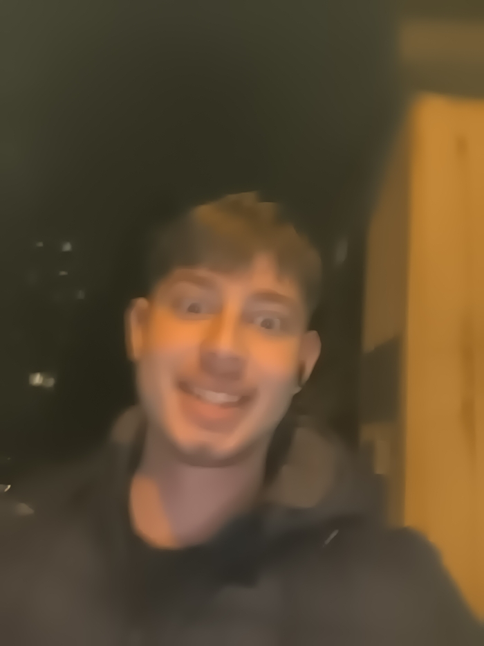 The image depicts a single male individual in a low-light setting, presumed to be in Sofia, Bulgaria. The photograph is notably blurry, indicative of motion blur or low light conditions. The subject, a male appearing to be in his late teens or early twenties, occupies the central portion of the frame. He possesses short, light brown hair. His facial expression is exaggerated, characterized by wide-open eyes and a broad, open-mouthed smile revealing teeth. A faint amount of stubble is visible on his chin. He is wearing a dark-colored, possibly black, hooded garment. The background on the left is predominantly dark, with several indistinct, blurry points of light visible in the distance, suggesting an urban outdoor environment at night. The background on the right features a vertical, light-colored (yellow/orange hue) structure or wall, illuminated by an artificial light source that casts a warm glow, particularly on the right side of the subject's face and hair. The overall illumination is uneven, with the right side of the scene being brighter. The individual is looking directly at the camera, with his expression suggesting an intentional interaction with the photographic device.