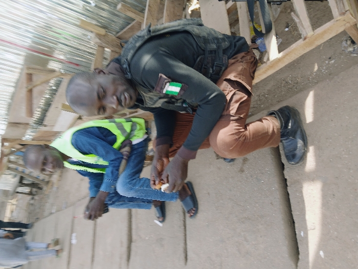 Two adult males are depicted outdoors in Masvingo, Zimbabwe. In the foreground, a dark-skinned male with a bald head and dark facial hair is observed, possibly squatting or sitting on a low wooden structure. He wears a dark long-sleeved shirt, a dark tactical vest featuring a patch resembling the Nigerian flag on the left shoulder, brown cargo pants, and black low-top shoes. He is actively engaged in holding and manipulating a small, light-colored food item with both hands. Behind him, to the left, a second dark-skinned male with a bald head is seated on a concrete surface. This individual wears a blue long-sleeved denim shirt layered with a bright yellow high-visibility vest, and dark sandals. He holds a dark cup with a red straw in his right hand, directing his gaze towards the viewer. The immediate ground is a light-colored concrete surface marked by two parallel, linear indentations or cracks. The background consists of various rough wooden structures, consistent with shelving or framework, and corrugated metal sheeting is visible further back on the right side. The scene is illuminated by natural daylight.
