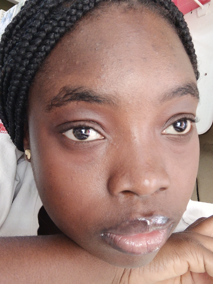 A close-up portrait shows a young woman with dark skin and braided hair. She has dark eyes and dark eyebrows. The light reflects off of her skin. She is wearing small heart-shaped gold earrings. Her lips are glossy with some visible white residue, possibly lip balm. The background is blurred, suggesting a shallow depth of field.