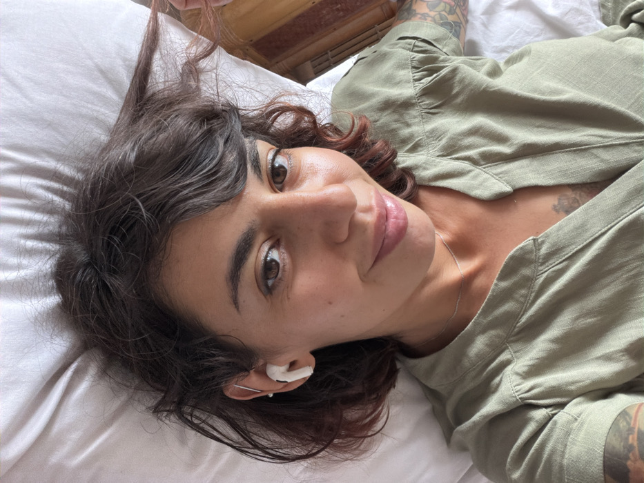 A woman lies on a white pillow with dark curly hair and light olive skin. She wears a light green shirt with visible shoulder tattoos. Her right ear contains a white hearing aid. Her expression is relaxed as she looks up at the camera. A sliver of wooden furniture is visible at the top of the frame. She has brown eyes, arched eyebrows, and a silver chain around her neck.