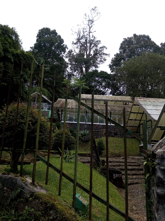 A partially obscured view through a green metal fence reveals a lush landscape with multiple greenhouses. The greenhouses have numerous windows and sloping roofs. Behind the greenhouses are various trees, including a tall, bare tree reaching towards the sky. Grass and a set of steps can be seen leading up towards the greenhouses. Vegetation fills the foreground, enhancing the sense of depth and creating a natural, slightly overgrown aesthetic.