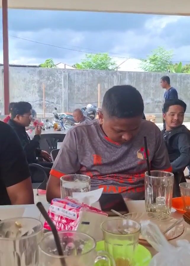 group of men sitting at tables in what appears to be an outdoor or semi-outdoor cafe setting. The tables are cluttered with glasses, coffee cups, plates, and other items, suggesting that the men are taking a break or having a meeting. Several men are visible in the video, most wearing casual clothing like t-shirts. One man in a grey t-shirt with orange detailing is looking down at his phone. Another man in a black t-shirt with the word "PIVOTAL" printed on it looks off into the distance with a serious expression. The background shows a concrete wall, some trees, and an overcast sky. There are also some motorcycles parked in the background, suggesting that some of the men may have arrived on bikes. The setting seems relaxed and informal.