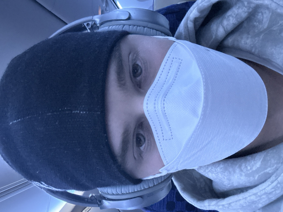 The image displays a close-up, head-and-shoulders portrait of an individual in an indoor setting. The specific location within the city of Ferno, Italy, is not discernible from the visual information provided. The person is wearing a dark knitted beanie, light grey over-ear headphones, and a white, pleated disposable face mask covering their nose and mouth. Their eyes are visible above the mask and directed forward, appearing to look at the camera. Their eyebrows are visible. Below the mask, a light-colored hooded garment, likely a hoodie, is visible on the torso. The background is blurred, indicating an interior environment consistent with a passenger compartment of a vehicle such as an airplane or train, with elements of artificial overhead lighting and blue patterned upholstery faintly visible. The scene is illuminated with a cool, bluish light.