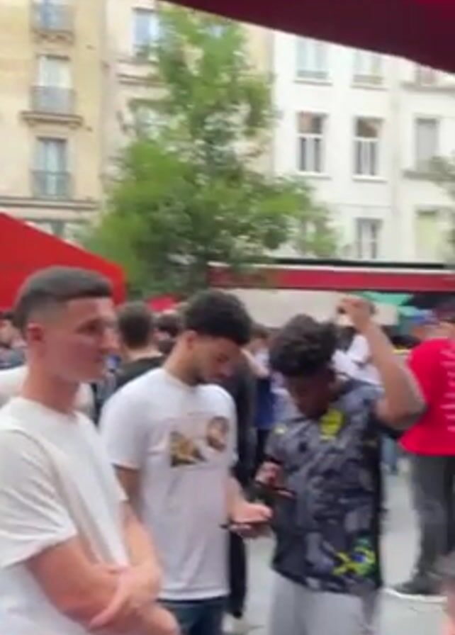 Here is a detailed description of the video: The video shows a street scene in what appears to be a European city, likely Paris, based on the architecture. The scene is bustling with people, many of whom appear to be young adults. Several people are wearing soccer jerseys, including those of Paris Saint-Germain (PSG), indicating a possible game day or celebration. The crowd is dense, and people are standing, walking, and milling about. The camera is positioned under the awning of a café or restaurant, which is decorated with red fabric and strings of lights. Patrons are seated at tables, while others are part of the crowd outside. The buildings in the background are multi-story, with typical Parisian architecture featuring light-colored facades and windows. The atmosphere seems lively and perhaps celebratory.