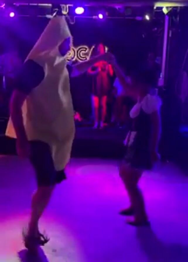 A man in a banana suit dances with a woman in a dirndl skirt on a dance floor illuminated with purple and blue lights. Behind them, on a stage, a band performs with female singers, under a sign reading “LOCAL.” The dancing occurs in a club setting with a partial view of an upper balcony.