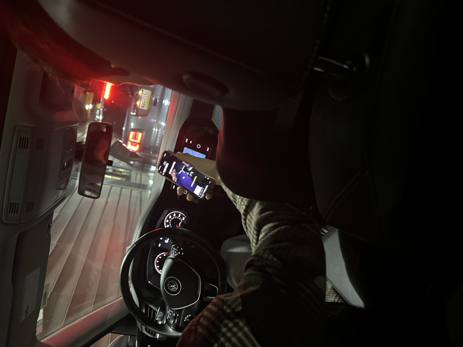 - "Inside a car at night, a person in the passenger seat holds a phone displaying a video or image" by FM-ja7R73, licensed under CC BY 4.0