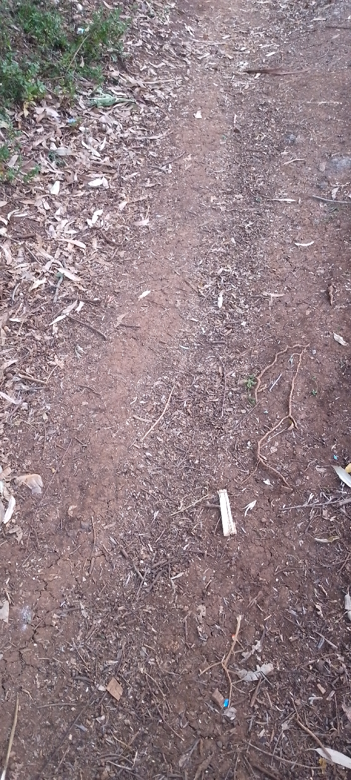 A dirt path, mottled with fallen leaves and small twigs, winds through the image. The ground is cracked in some areas, revealing dark soil. A few pieces of trash are scattered along the path, including a small piece of cardboard and fragments of plastic. A patch of green grass and leaves borders the path on one side. The overall scene suggests a natural, possibly wooded area.