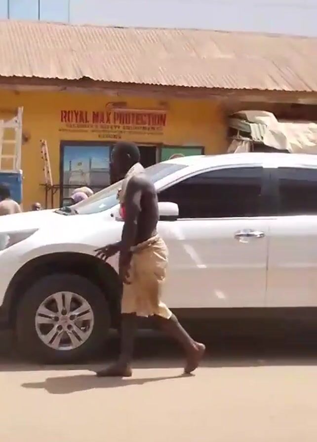 A man with a dark complexion, bare-chested and wearing tan shorts, walks barefoot down a street. He carries a water bottle in one hand and has a cloth draped over his shoulder. He passes by a white car, then a parked truck with a blue flatbed, and then a gray car. Buildings are visible in the background. The video ends with a close-up shot of a blue and white patterned strap hanging against an orange fabric.