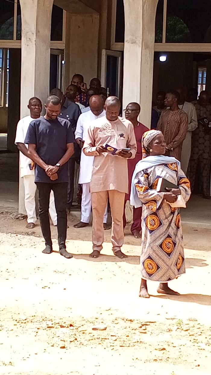 A group of approximately 15-20 individuals is gathered outdoors in Egbedi, Nigeria, standing on an unpaved, light-brown dirt ground. The setting is in front of a light-colored building featuring multiple pillars and visible windows. Natural daylight illuminates the scene. In the foreground, from left to right: a male individual wearing a dark blue short-sleeved t-shirt and dark trousers stands with hands clasped in front and head slightly bowed. Adjacent to him, a second male, dressed in a light tan traditional tunic and trousers, holds a small, colorful booklet in both hands, looking down at it. To the right, a female individual in a patterned dress and a light blue headwrap holds a dark book and white paper in her left hand, looking towards the right side of the frame. All three foreground subjects are barefoot. In the midground and background, additional individuals, primarily male, are positioned behind the foreground subjects. They are dressed in various forms of traditional and casual attire, including white and light-colored garments. Many in the background also appear barefoot. The group exhibits varied postures, with some looking forward and others looking down. The individuals are part of a visible gathering or assembly.