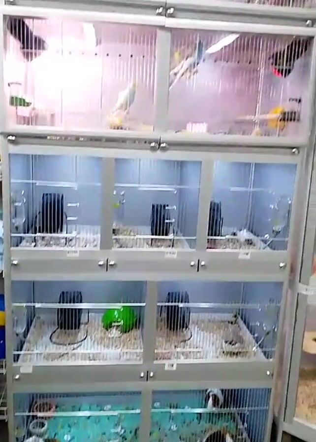 tall, multi-level pet cage, possibly in a store. The cage is silver-colored and contains a variety of animals. The top levels hold several colorful birds like parakeets, with perches and food. The middle levels house small rodents, possibly hamsters or gerbils, each in their own compartment with food bowls, exercise wheels, and bedding. The bottom level contains what appear to be guinea pigs in enclosures decorated with teal-colored bedding. The cage structure includes transparent panels, likely made of plastic or glass, allowing viewers to observe the animals. To the right of the cage is a shelf stocked with pet food and other pet care products.