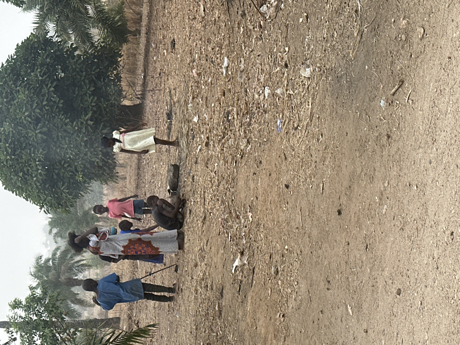A group of people stand on a dirt path next to a sparse field. One woman holds a baby. Children in dresses and shirts are visible. A man is crouched over, possibly working on something on the ground. Scattered debris is visible on the path and field. Trees and palms are visible along the sides of the frame.