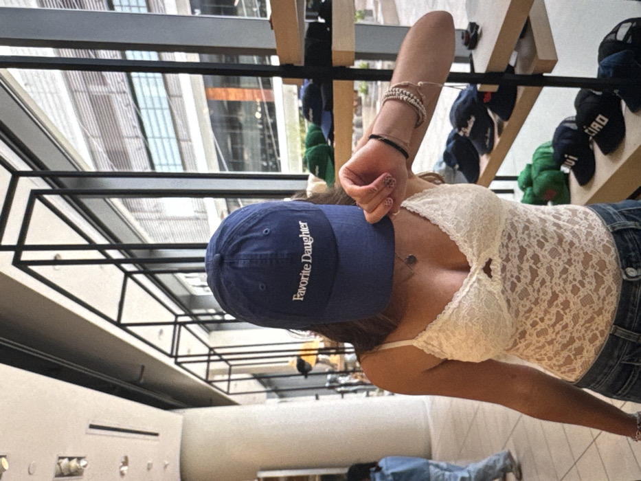 The image depicts a female individual in a retail store, identified as "Favorite Daughter" by the branding on a navy blue baseball cap worn by the subject