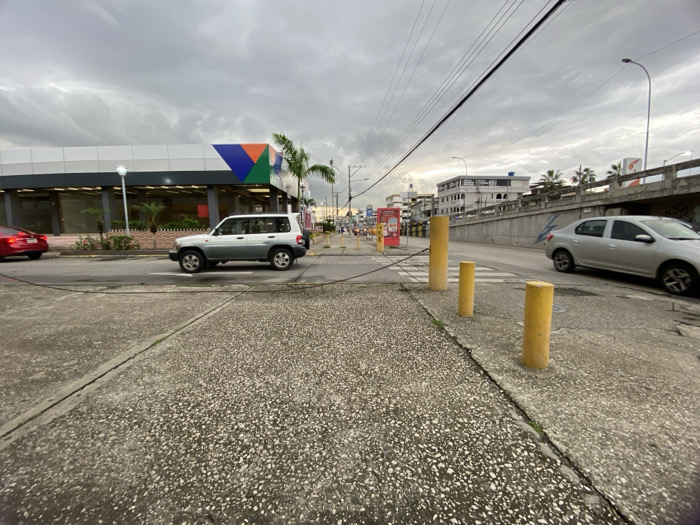 A street scene shows a gray SUV crossing an intersection near a building with a geometric design. A silver sedan is parked on the right side of the street. Yellow bollards line the sidewalk. Power lines stretch across the overcast sky. A bridge is visible in the background, alongside other buildings and palm trees. The foreground sidewalk is cracked.