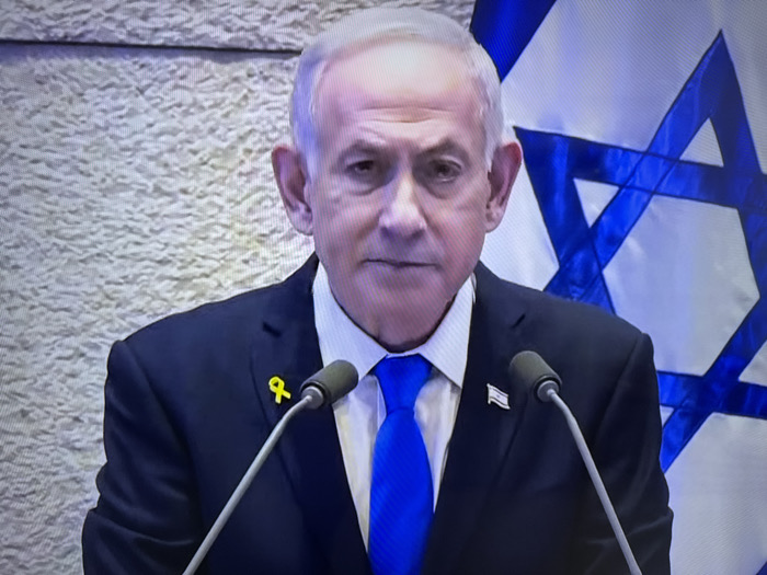 The image captures Benjamin Netanyahu, an adult male with silver hair, from the chest up, centered in a formal indoor setting