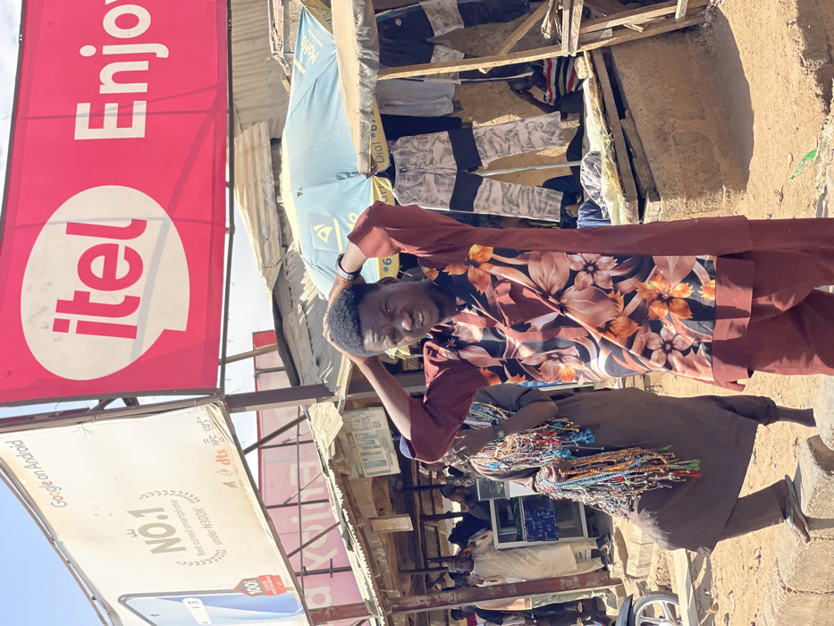 The image depicts an outdoor market or street scene in Chikaji, Nigeria, under bright daylight. In the foreground, a young Black male stands centrally, facing slightly left and looking directly at the camera. He wears a long-sleeved collared shirt with a maroon base and a prominent orange and brown floral pattern on the torso and sleeves, paired with matching maroon trousers. His hands are raised to his head, with fingers interlocked over his hair. To his left, partially obscured, stands another Black male wearing a dark brown long garment and flip-flops, holding numerous strands of colorful beaded necklaces and prayer beads, indicative of a vendor. Above the scene, two large billboards are prominently displayed. The billboard on the left is white, featuring "Google on Android" at the top, a "No.1 Best curved smartphone under N300K" advertisement with a partial smartphone image, and logos for DTS and NFC. The billboard on the right is red, displaying "itel" in a white speech bubble graphic, followed by "Enjoy". Below these billboards, multiple informal market stalls are visible, constructed with corrugated metal roofs and wooden supports. Under a light blue umbrella, several pairs of trousers, including one with a gray camouflage and black block pattern, are displayed for sale. Other individuals are visible in the background, congregating near these stalls. The ground in the foreground is dry earth, separated by a concrete curb from the market area. A partial view of a white motorcycle is visible on the far left.