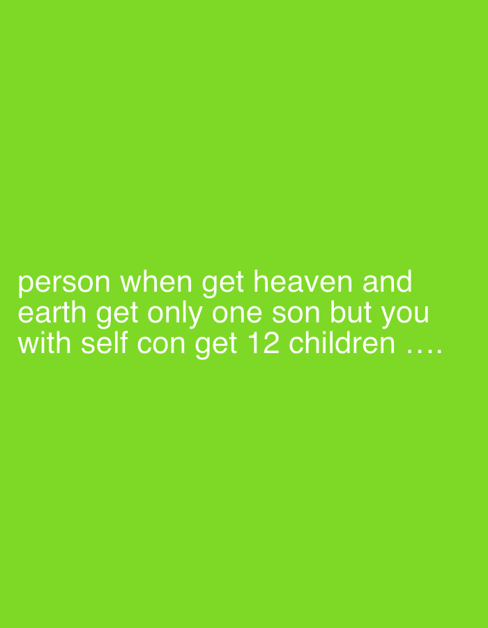 The image displays a solid lime green background. White text is overlaid in the lower-middle portion of the frame, spanning three lines. The text reads: "person when get heaven and earth get only one son but you with self con get 12 children ....". No individuals, objects, or actions are visually depicted beyond the text and colored background. The scene is situated in Iranla, Nigeria.