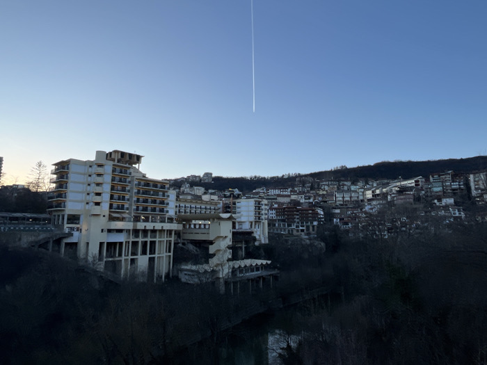 This image displays a panoramic view of the city of Veliko Tarnovo, Bulgaria, at what appears to be either dawn or dusk, characterized by low-angle natural light. The scene is dominated by urban development built into a steep, tree-covered hillside, with a body of water, likely the Yantra River, partially visible in the dark foreground. In the mid-ground, a large, multi-story concrete building complex stands prominently. This structure features terraced levels, numerous balconies, and exposed concrete framing, suggesting it is either incomplete or abandoned. Some window openings show light-colored frames or temporary coverings. Elevated walkways or structural connections extend from this primary building. Further up the hillside, numerous other residential and commercial buildings are densely packed, with varying architectural styles and roof colors. The natural terrain is integrated with the urban sprawl, showing sparse, dark, deciduous trees, indicative of winter or early spring, especially in the foreground and on less developed parts of the hill. The sky is a clear, gradient blue, transitioning from lighter tones near the horizon to a deeper blue overhead. A single, distinct white contrail from an aircraft is visible stretching vertically in the upper left quadrant of the sky. No individuals or specific actions are discernible in the scene.