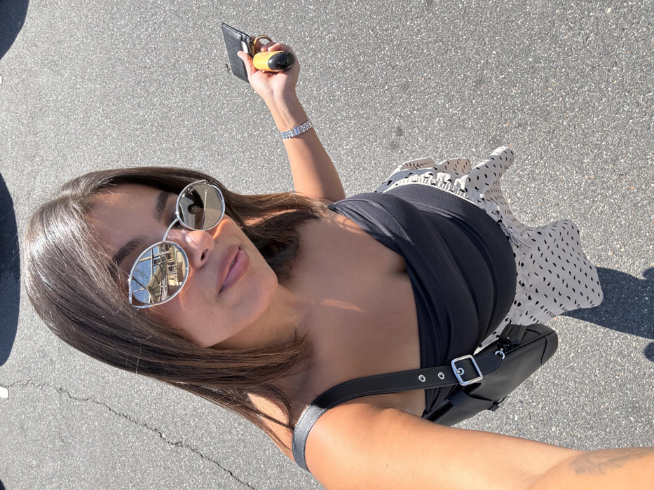A female subject is depicted in a high-angle selfie, standing on asphalt pavement in West Windsor, United States, under bright sunlight. She has brown, shoulder-length hair and wears silver-framed, mirrored sunglasses, a black strapless top, and a light-colored skirt with dark, irregular dashed patterns. A black shoulder bag with a silver buckle strap hangs on her left side. On her right wrist, she wears a silver-toned watch or bracelet. Her right hand holds a black wallet or card holder and a yellow-capped cylindrical object. Reflections in her sunglasses reveal an outdoor structure, possibly a canopy or awning, in the left lens, and a white vehicle in the right lens. Shadows are visible on the pavement.