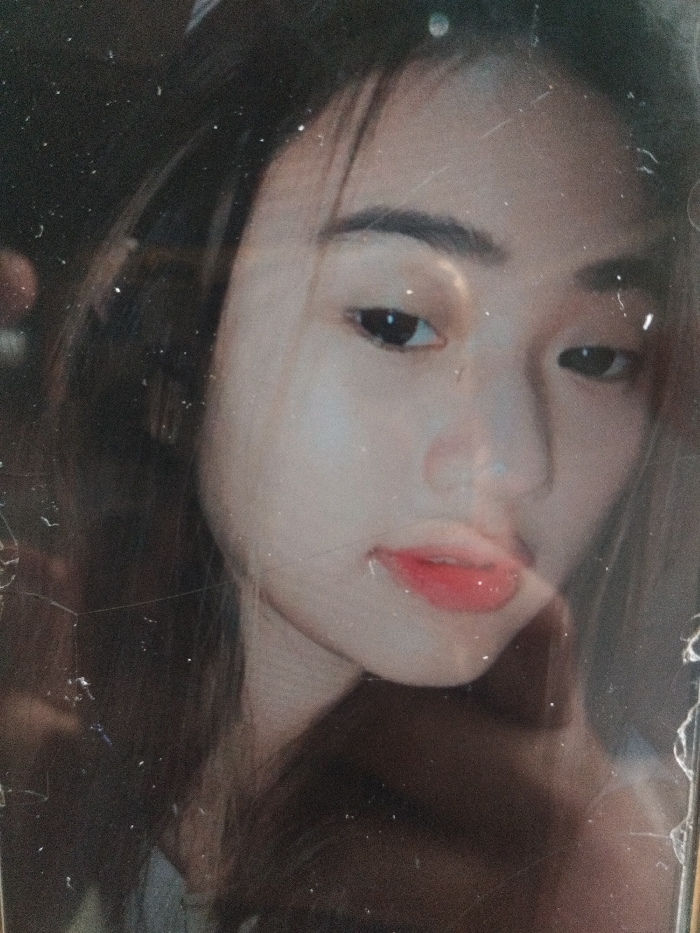 The image displays a close-up portrait of a single individual, a young adult female of East Asian or Southeast Asian appearance, centered in the frame