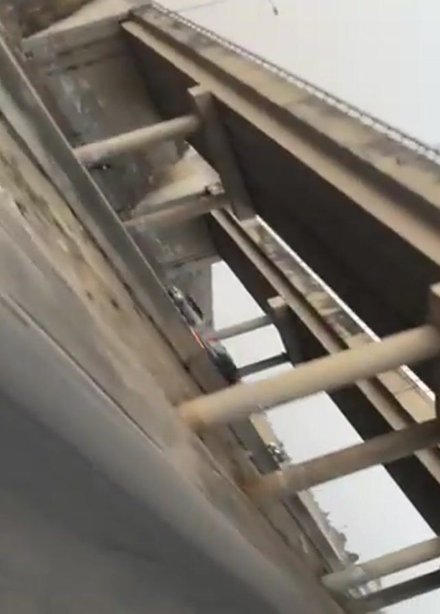 view looking up from inside a car through an open sunroof, towards a highway overpass. Initially, the underside of the overpass is visible, including its structural supports and the road passing beneath. Cars are visible on the lower roadway. As the camera angle changes, the sky and the roadway above the overpass come into view. The weather appears overcast.