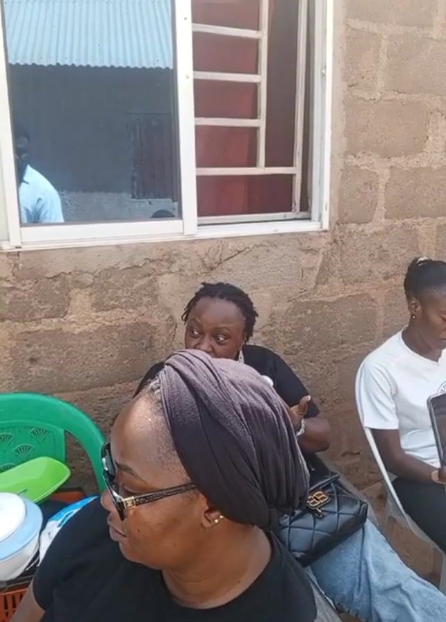 three women sitting outside a building with a window in the background. The woman in the foreground wears a black t-shirt with the words "KUNAK FOUNDA" visible and a black headwrap. She is also wearing sunglasses. The woman in the middle has short hair and wears a black t-shirt. She is talking and gesturing with her hands. The woman on the right wears a white t-shirt and is looking at a mobile phone. The building has a brick wall. A man can be seen through the window. There are chairs and containers next to the women. The scene appears to be outdoors during the day.