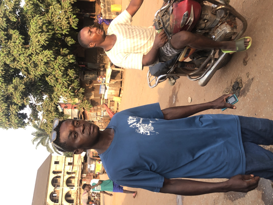 This image depicts an outdoor street scene in Neni, Nigeria. In the foreground, a dark-complexioned adult male stands, facing the camera with a neutral expression. He wears a dark blue short-sleeved t-shirt with a white abstract design on the left chest, dark trousers, and dark sunglasses resting on his head. His right hand holds a small, light blue mobile phone. To his right, a second dark-complexioned adult male sits on a red motorcycle, wearing a light-colored striped t-shirt, patterned shorts, and olive green flip-flops. He looks towards the right side of the frame, with his hands near the handlebars. The motorcycle features chrome details and an exposed engine. The background reveals an unpaved reddish-brown road. On the left, a multi-story light-colored building with arched windows and balconies is visible. Further left, another male figure in a light green t-shirt and dark shorts walks away from the camera. In the middle ground, a yellow three-wheeled vehicle (tricycle) is partially visible. On the right, various rudimentary structures, possibly market stalls made of wood and corrugated metal, line the road. A large tree with dense green foliage occupies the upper right background. A low concrete wall and a yellow container are also present on the far right. The scene is illuminated by daylight, casting soft shadows.