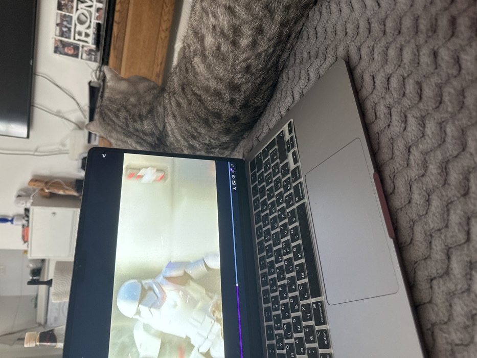 This image depicts an interior residential scene located in the city of Be'er-Sheva, Israel. In the foreground, a silver-colored laptop, resembling a MacBook, is open on a textured gray blanket with a wavy pattern. The laptop's keyboard features both Latin and Cyrillic characters, covered by a clear silicone protector. A small pink tab is affixed to the bottom edge of the laptop. The screen displays a scene from a video, showing a character in white futuristic armor, similar to a Stormtrooper, moving leftward, with a red and white striped object partially visible to the right. A video player interface is visible at the bottom of the screen. To the right of the laptop, a gray tabby cat with distinct dark stripes lies on the same blanket, facing away from the camera and towards the background. Only its back, head, and ears are visible. In the background, a flat-screen television is mounted on a light-colored wall. Below the television, a wooden media console holds multiple framed photographs and a decorative sign spelling "HOME". Further to the left in the background, a partial view of a kitchen or utility area includes white cabinets, various bottles, and a paper towel holder. Visible wires extend from behind the television and console. No people are present in the frame.