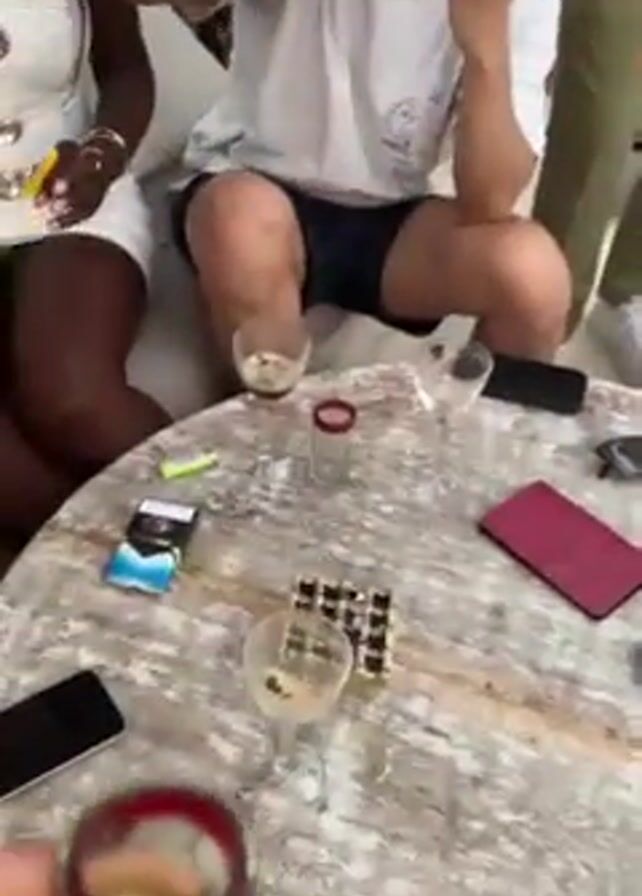 A group of people celebrate by clinking shot glasses together. There are at least five people visible, with varying skin tones, dressed in casual attire. A fair-skinned person with glasses sits with an orange slice in their hand. The shot glasses are clear with a red rim. There are several objects on the table including a passport, sunglasses, and packs of cigarettes.