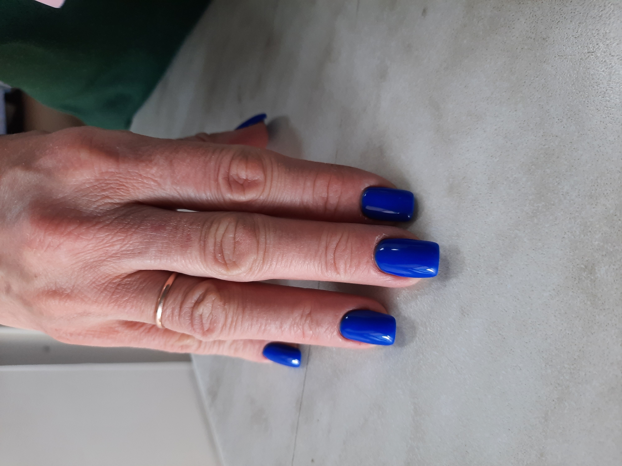 A close-up shot captures a Caucasian woman's left hand resting on a light-colored, slightly textured surface. The woman's fingers are adorned with glossy, dark blue nail polish. A simple gold band is visible on her ring finger. The backdrop is blurred, showing hints of green and white hues. The image may have been taken in an indoor environment in Krasnogorskoye, Russia.