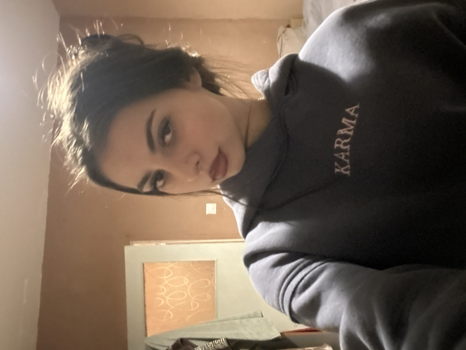 A young adult female is depicted in a close-up, indoor selfie