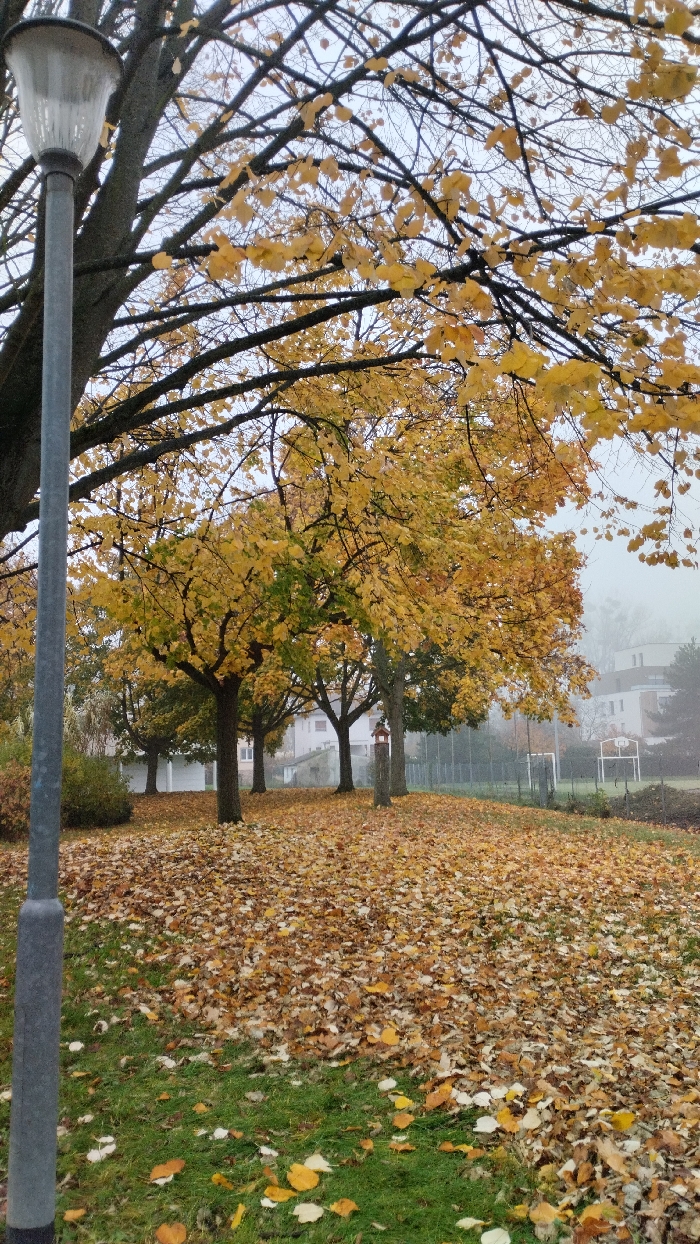 This image presents an autumnal park scene in Bischheim, France, under an overcast sky. A grey street lamp with a fluted, translucent white fixture stands vertically in the far left foreground. The ground immediately beneath and extending into the midground is a mix of green grass heavily covered with a dense layer of fallen yellow, orange, and brown deciduous leaves. Numerous trees with predominantly yellow-gold foliage are distributed throughout the midground, their dark branches partially visible through the leaves. Several tree trunks rise from the leaf-covered ground. To the right of center, a wooden structure resembling a bird feeder or small decorative post is positioned near a tree. In the background, partially obscured by atmospheric haze, are several residential buildings, predominantly white with dark roofs. A fence runs horizontally across the mid-to-background, behind which two white soccer goal frames are visible on a grassy field. No people or animals are present.