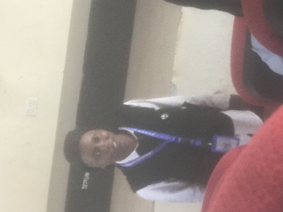 The scene depicts an indoor setting, likely an auditorium or lecture hall, located in the city of Agwala, Nigeria. A young adult male with short dark hair and dark skin is positioned centrally, facing forward, and smiling faintly. He is dressed in a white long-sleeved collared shirt, a dark vest, and a blue lanyard with an identification badge hanging around his neck. The badge's details are not discernible. Behind him, a light-colored wall features a prominent dark horizontal band extending across the mid-ground. White text spelling "TETFUND" is visible on the dark band to the left of the male subject's head. A wall outlet or light switch is mounted on the upper right section of the light-colored wall. The foreground shows the upper parts of several red upholstered seats, suggesting the image was captured from an audience perspective. There are no explicit interactions with other individuals visible in the frame.
