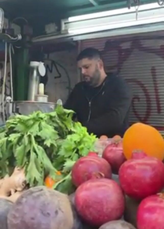 A man with a beard is working at a juice stand. He is wearing a black hooded jacket and is standing behind a display of various fruits and vegetables including beets, pomegranates, oranges, ginger, and celery. He appears to be preparing juice using a juicing machine behind the fruits and vegetables. The stand is under a covered area with graffiti on the walls.