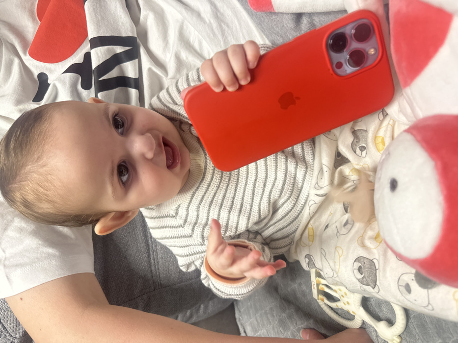 - "A baby, lying on their back, holds a red iPhone in their right hand" by FM-0OqHq2, licensed under CC BY 4.0