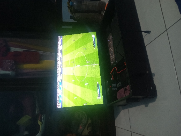 A television screen displays a soccer game, showing a green field with players in white and blue uniforms. The screen is partially obscured by a black computer tower with a visible JBL logo. The computer tower also contains wires and other computer components. The tower is placed on a white tiled floor. The overall lighting in the room is bright.
