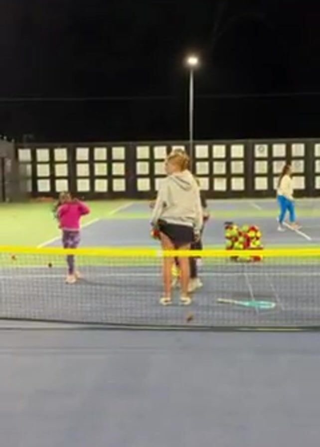 several individuals on a tennis court at night. The court is blue with green sidelines. There's a standard tennis net separating the halves. A light pole illuminates the court. Behind the court, there's a black fence with white rectangles on it. One person, wearing a pink top and patterned leggings, is actively hitting tennis balls. Another person is wearing blue pants and a white top. Three other people, dressed in more casual clothing, stand near a wire basket filled with tennis balls, presumably coaching. They offer instructions and feedback after each shot. One coach is wearing a grey sweatshirt, one is wearing a white sweatshirt, and the third is partially obscured. Tennis rackets are visible near the basket.